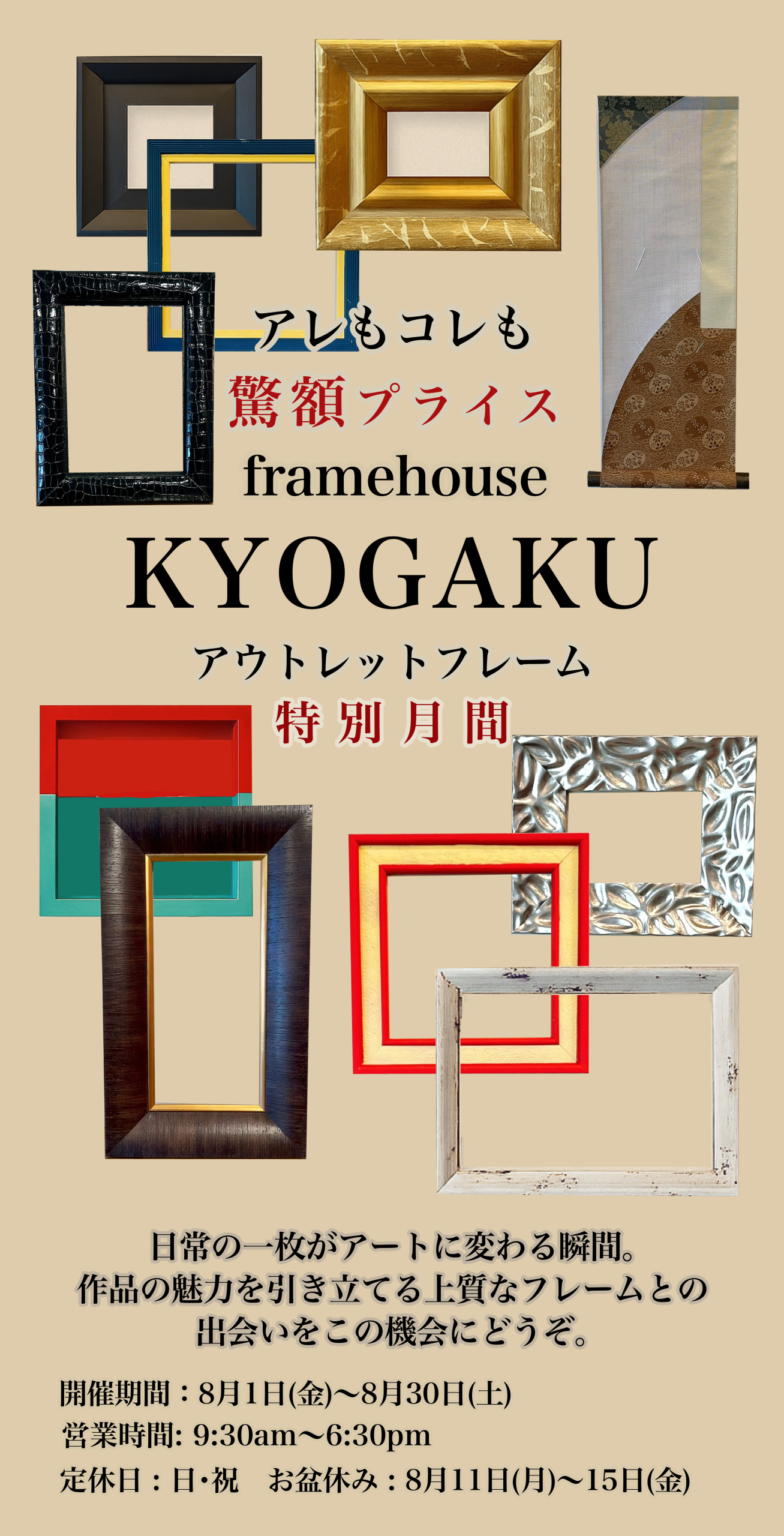 京額ギャラリー8月1日(金)~8月30日(土)まで額縁のアウトレットセールを開催致しております。